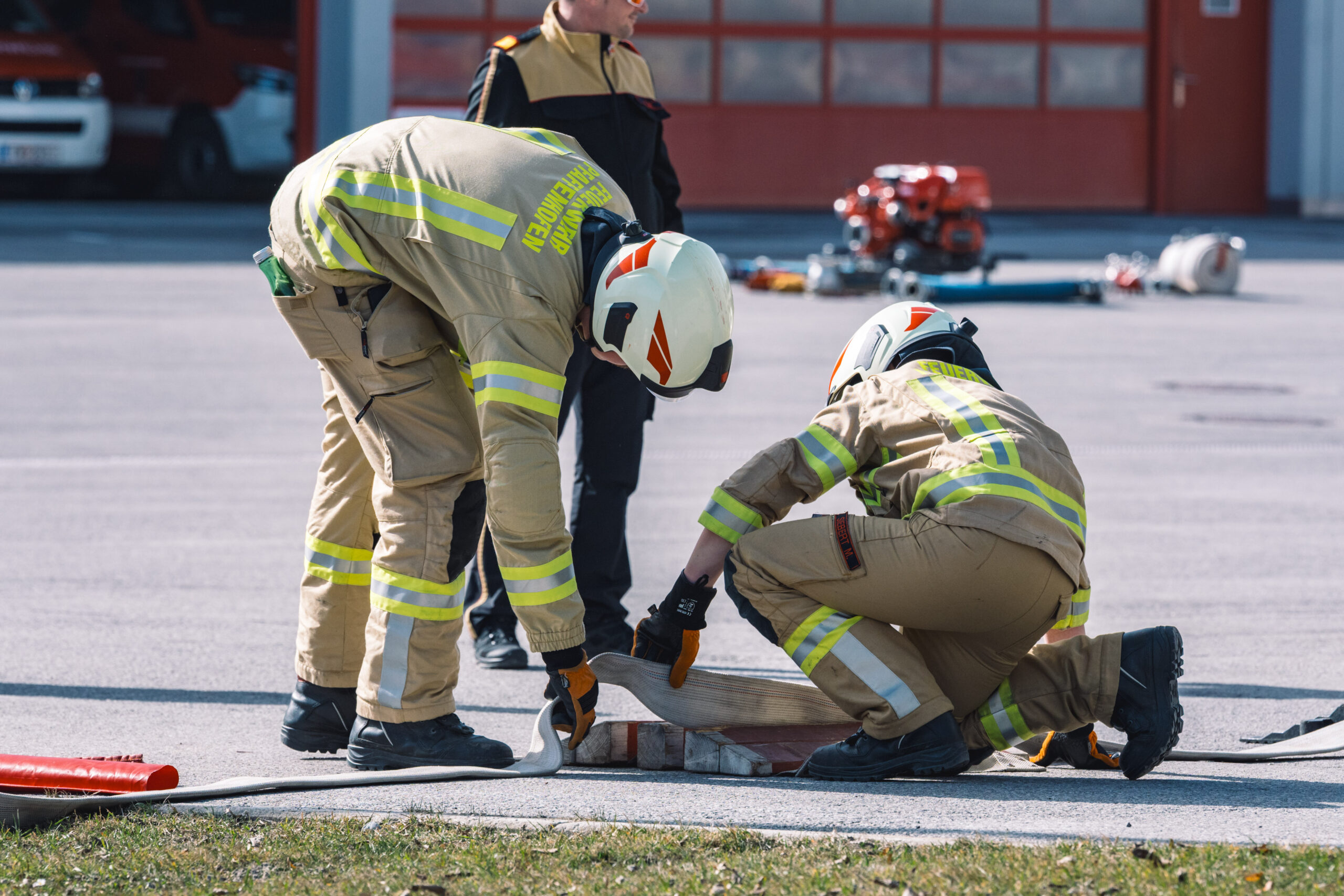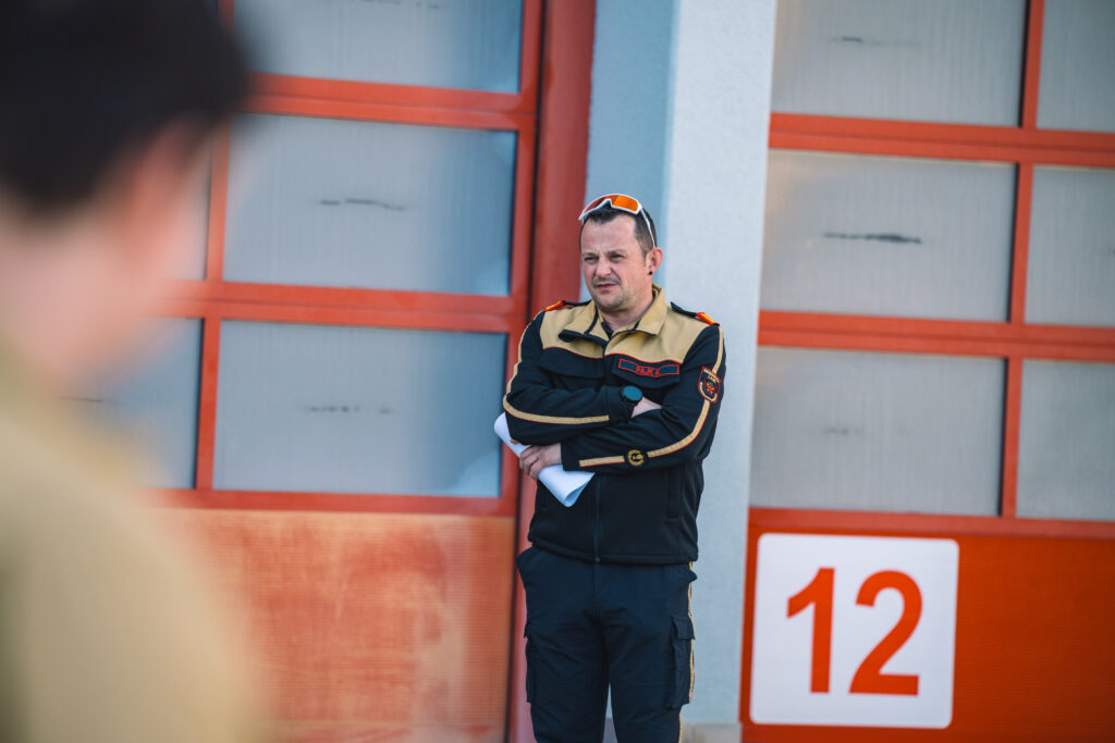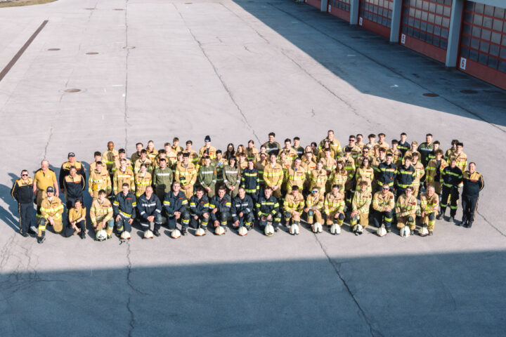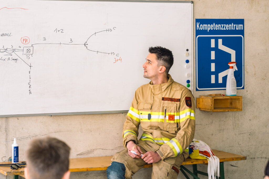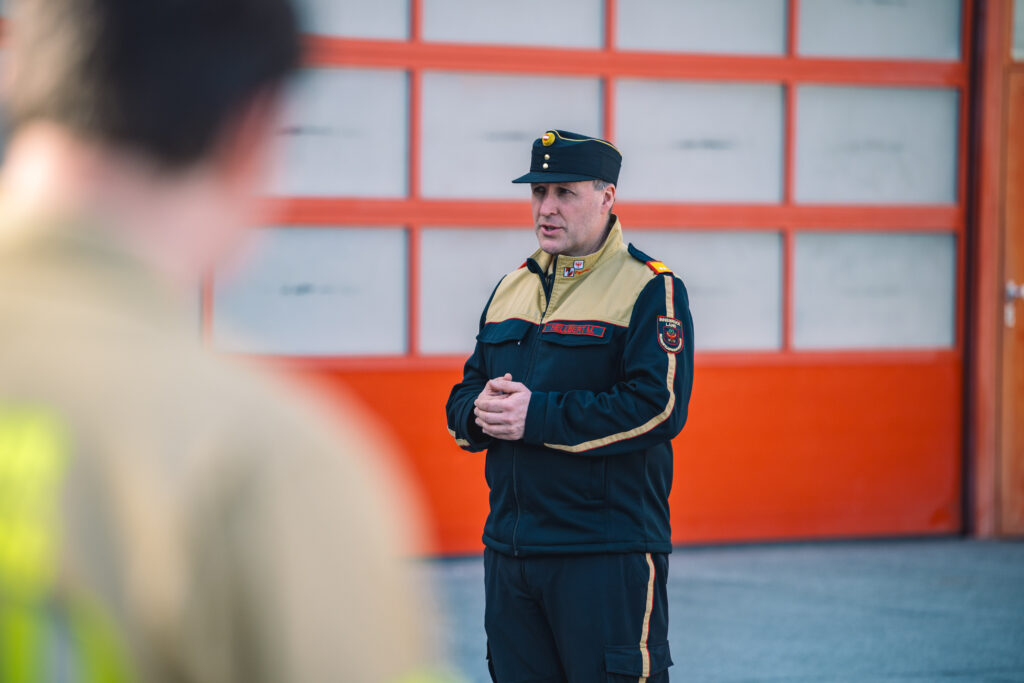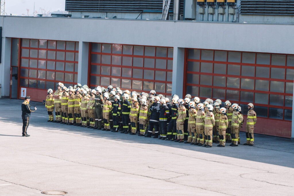 Bezirksfeuerwehrkommandant-Stellvertreter BR Martin Hellbert und Sachgebietsleiter Ausbildung ABI Karl Pajk teilten die 78 Teilnehmer:innen nach der Begrüßung in neun Gruppen für den Praxistag ein.