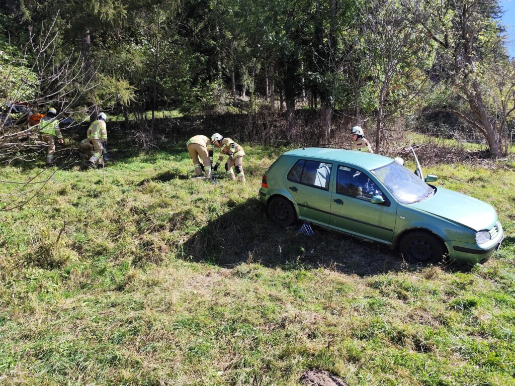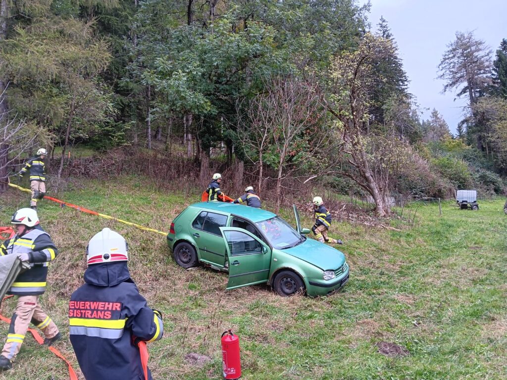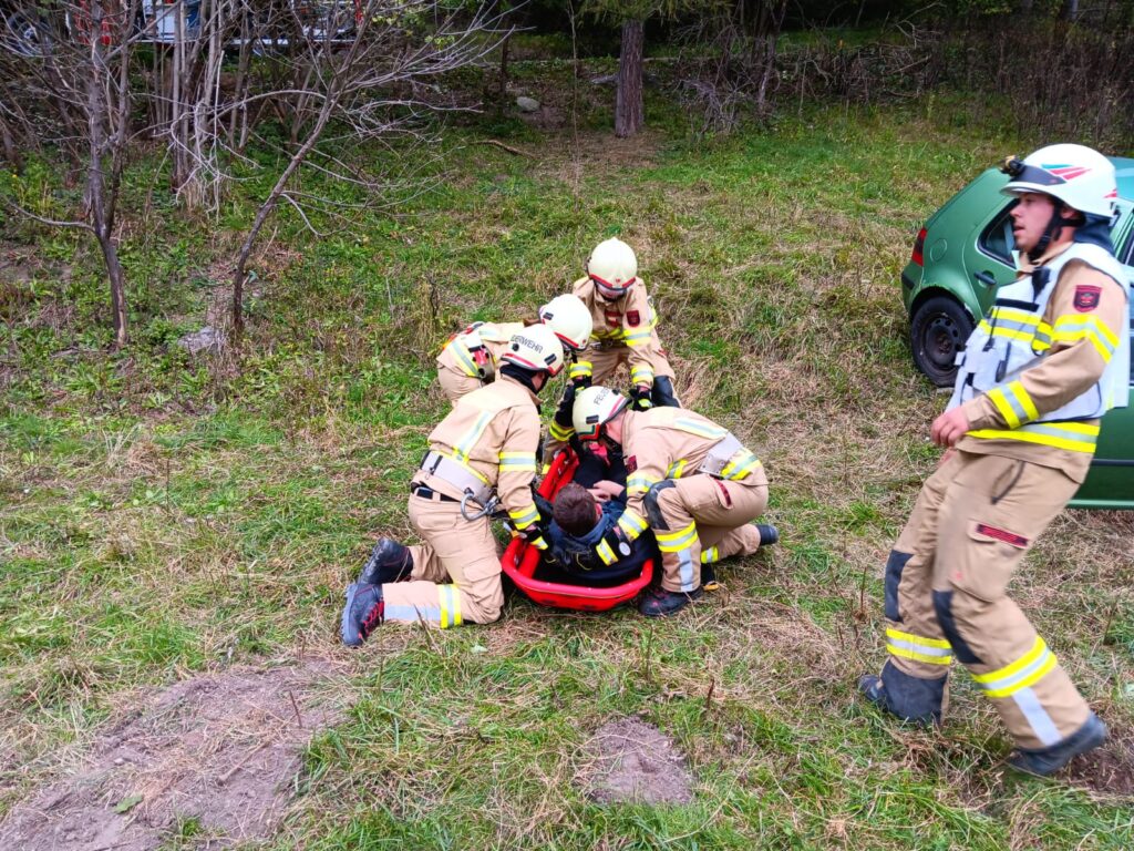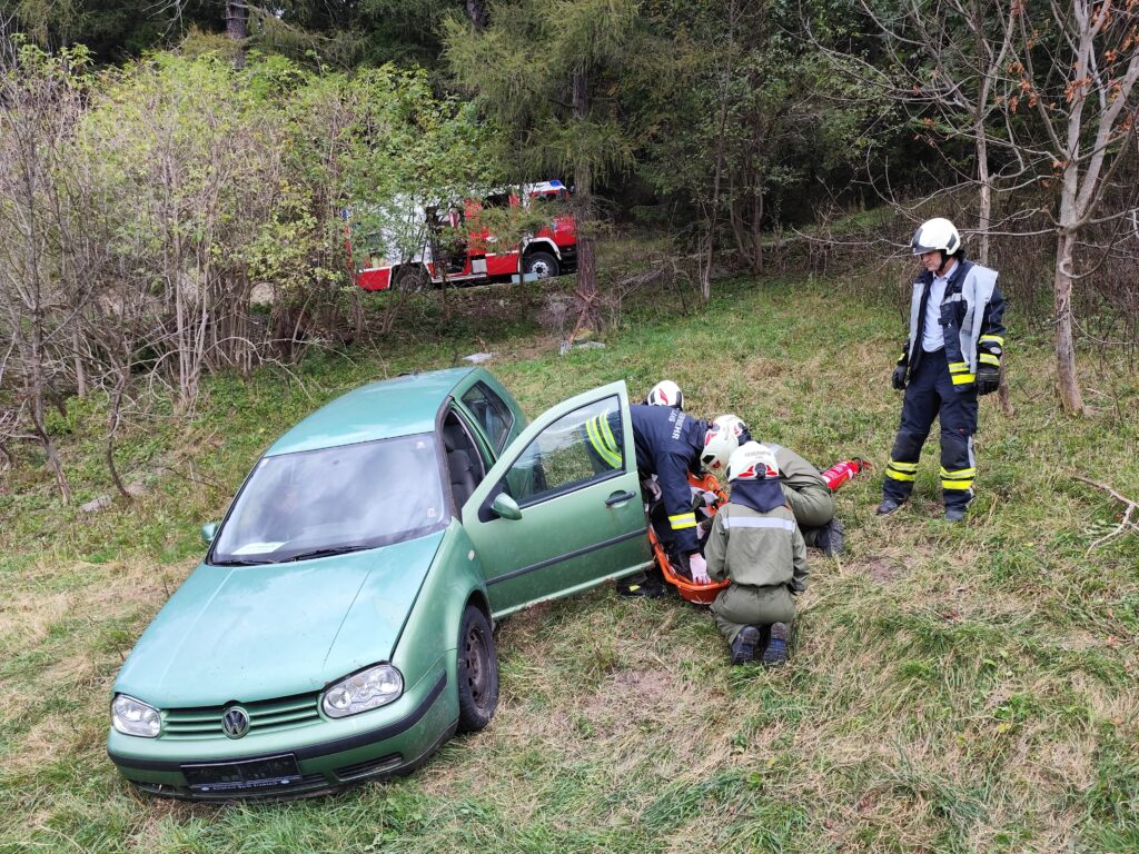 Übungsannahme war, ein vom Weg abgekommenes und abgestürztes Fahrzeug vor weiterem Abrutschen zu sichern, den Brandschutz aufzubauen und die sich im Fahrzeug befindlichen Personen zu retten, damit diese an den Rettungsdienst übergeben werden konnten.