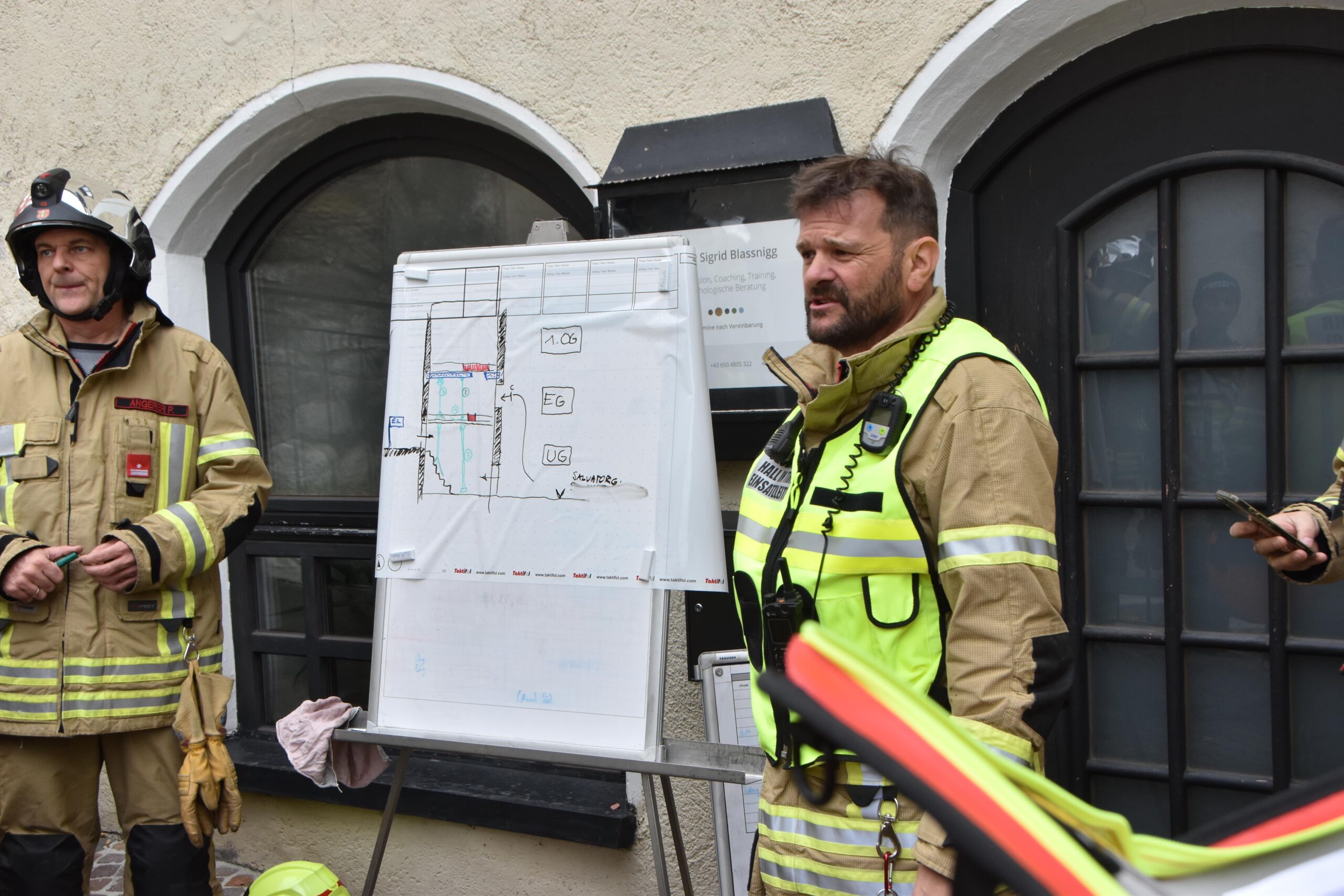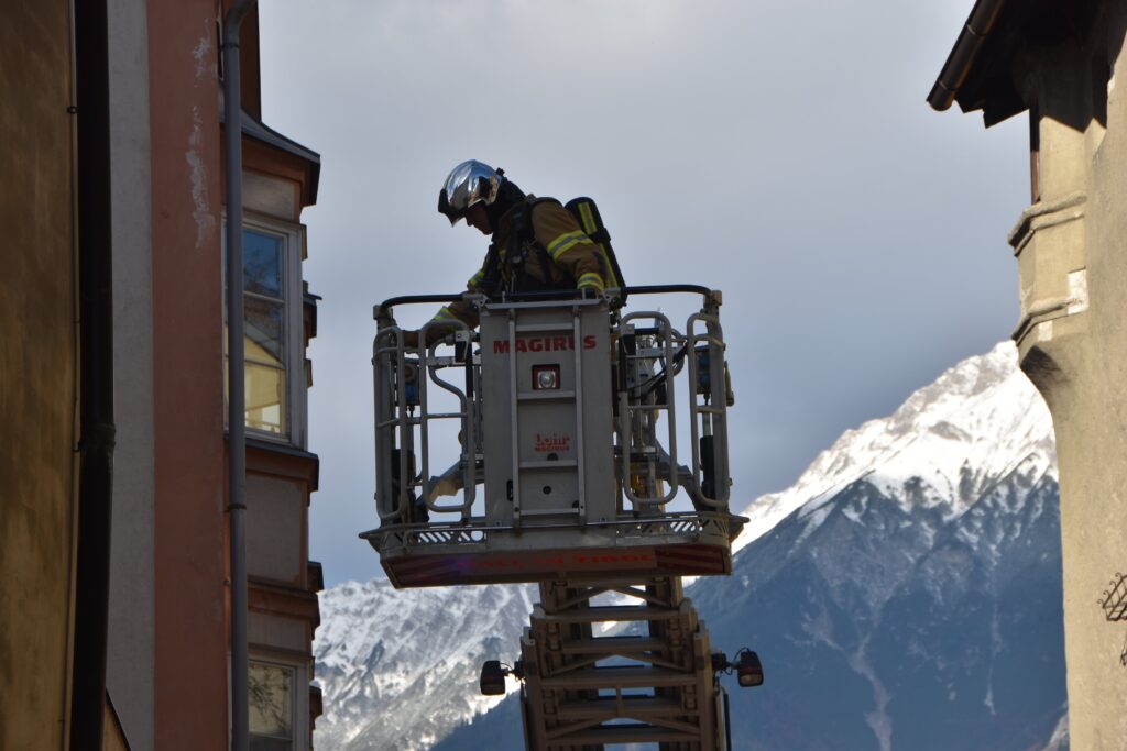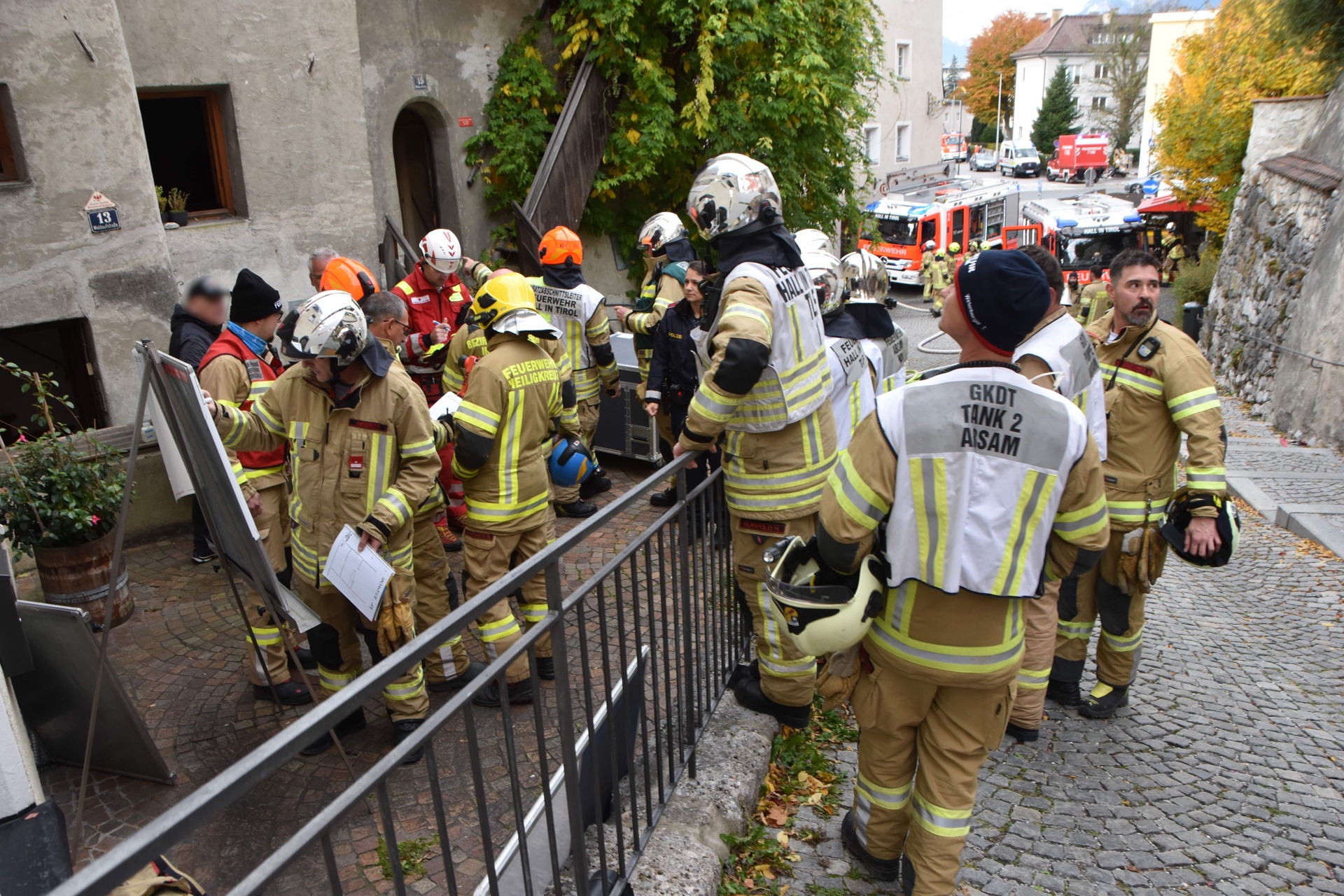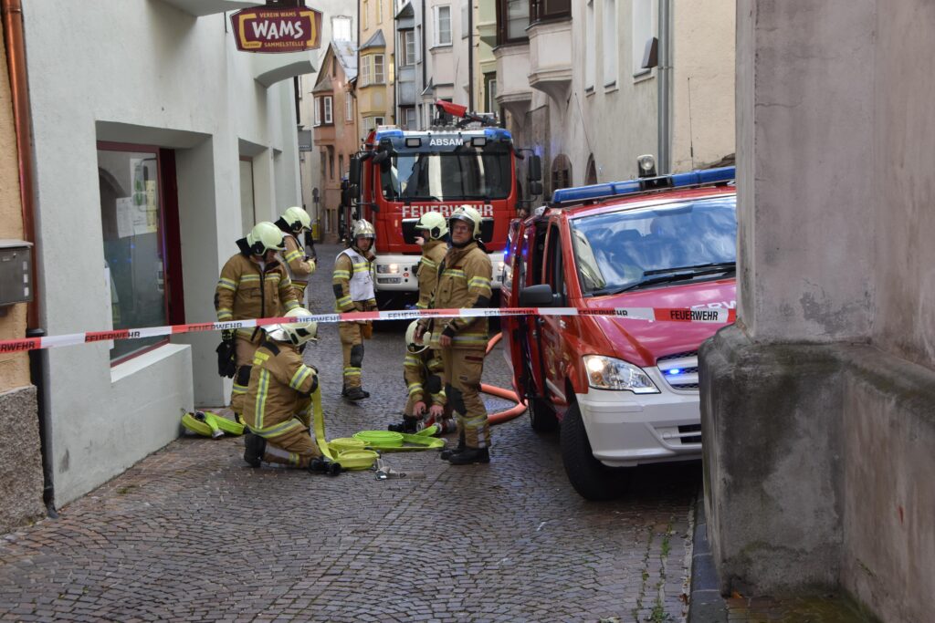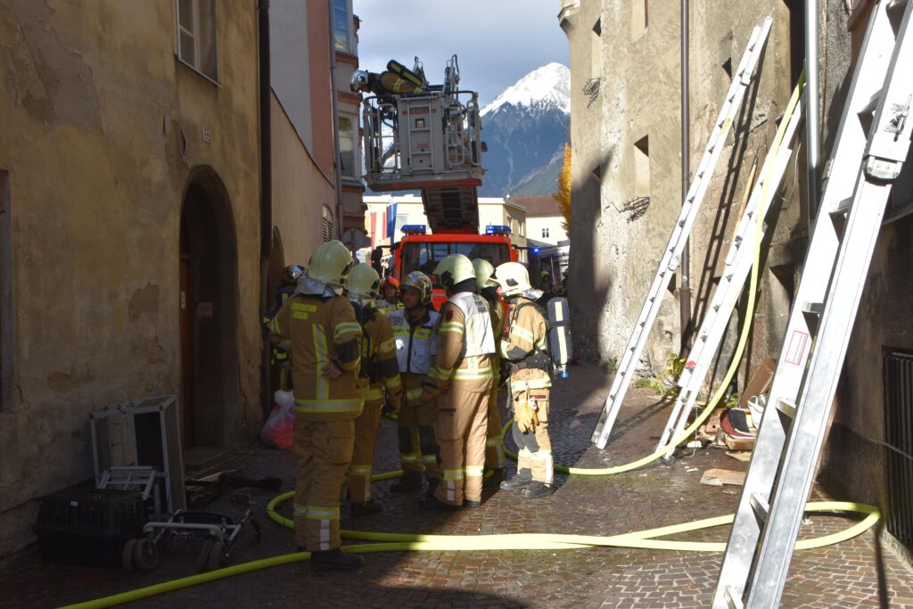 In der Anfangsphase wurde auch eine Lageführung im Nahbereich aufgebaut. Hier konnte den eingesetzten Kräften die notwendigen Sicherungsmaßnahmen im Hausinneren anschaulich erklärt werden. Neben dem betroffenen Gebäude wurden auch die angrenzenden Häuser kontrolliert. Die Einsatzkräfte standen vor mehreren Herausforderungen: In den jahrhundertealten Altstadthäusern gibt es oft nur eine schmale Brandwand, Tramdecken verlaufen durchgehend von einem Haus ins andere, nicht bekannte Verbindungsöffnungen führten zu Rauchausbreitung, usw. Diese und weitere Umstände trugen in Summe zu einem langwierigen Einsatz bei. Während des Einsatzes informierte sich auch Bürgermeister Dr. Christian Margreiter über das Ausmaß des Einsatzes.