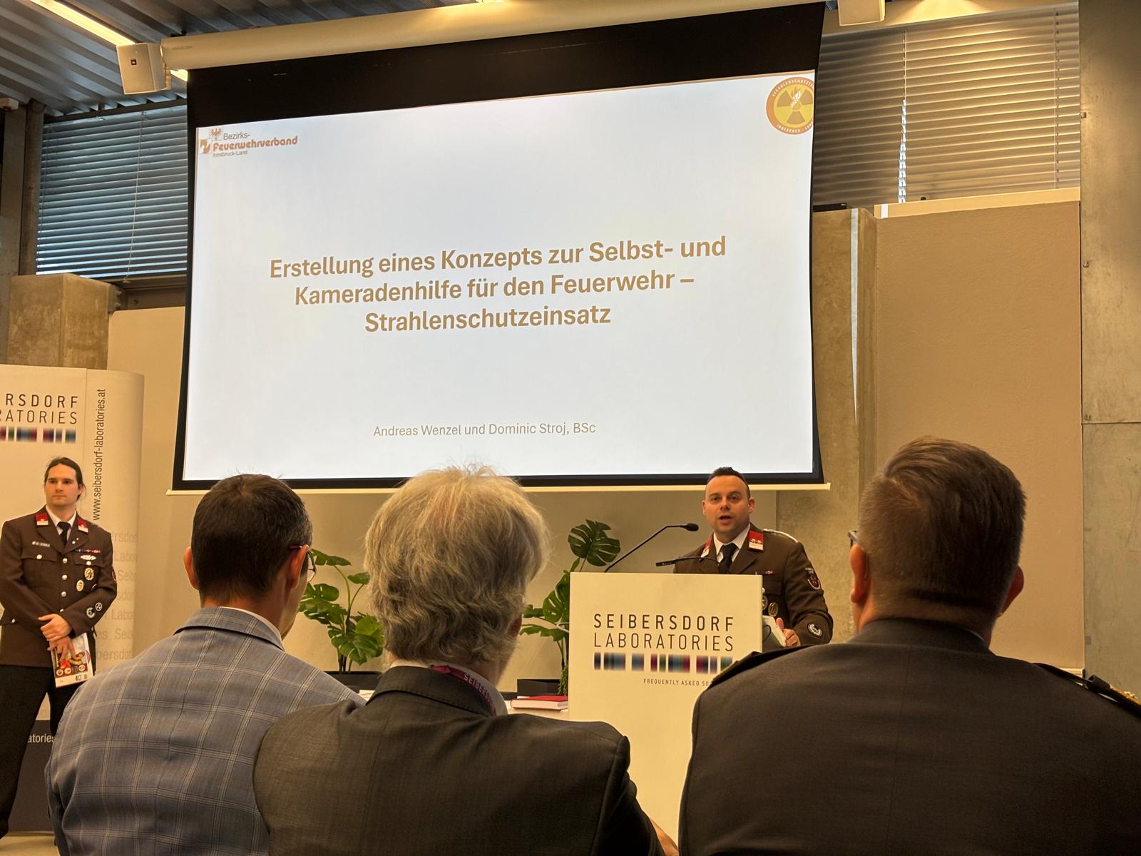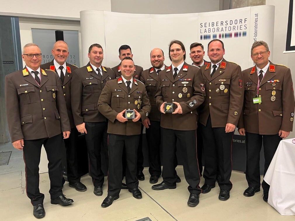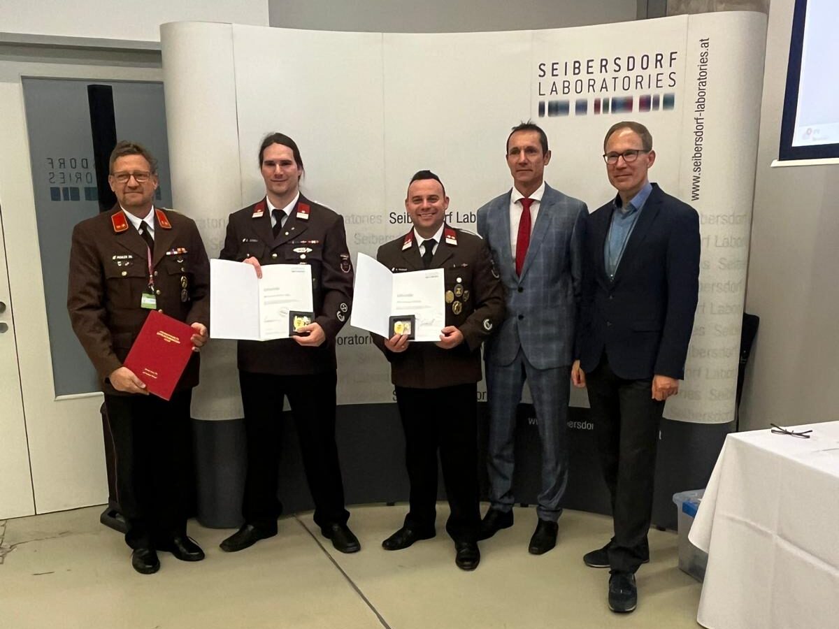 Bei der Verleihung in Seibersdorf waren der Betreuer und Fachexperte Dr. Thomas Pichler, Bezirksfeuerwehrkommandant Thomas Reiner, Abschnittskommandant Matthias Hagele, Kommandant-Stellvertreter Mario Schrott, Zugskommandant Tobias Schneider, Ausbildungsleiter Philipp Hosp und Landessachgebietsleiter Strahlenschutz a.D. Anton Plank anwesend und gratulierten zum Leistungsabzeichen. Seitens der Seibersdorf Akademie wurden Dominic Stroj und Andreas Wenzel für die umfangreichste Gold-Arbeit seit Einführung der Leistungsbewerbe gelobt!