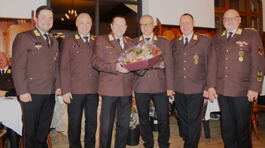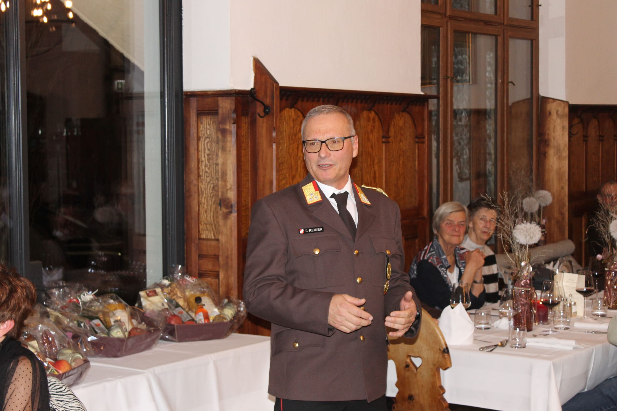 Bezirksfeuerwehrkommandant OBR Thomas Reiner dankte in seiner Ansprache dem Bezirkskommando, allen Abschnittskommandanten, den Sachgebietsleitern sowie Funktionär:innen mit Sonderfunktionen für die gute Zusammenarbeit im abgelaufenen Jahr. Anschließend wurden Präsente für runde bzw. halbrunde Geburtstage an vier Kameraden übergeben: